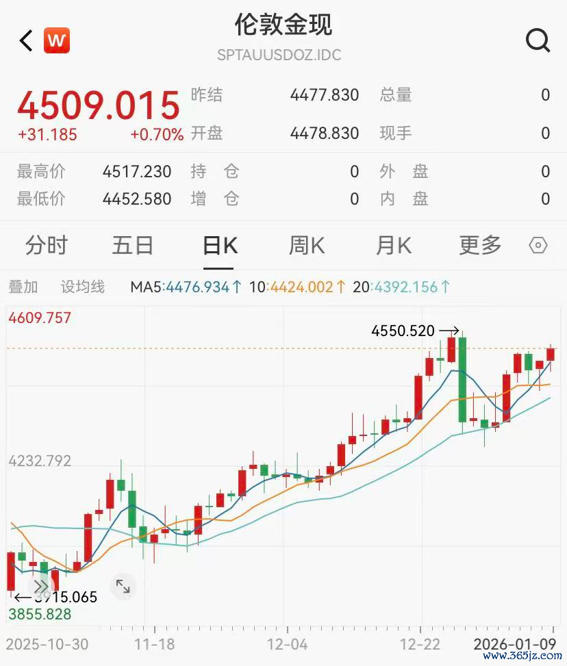 截至1月9日,现货黄金收报4509美元/盎司,小幅上涨0.7%;现货白银逼近80美元/盎司关口,涨近4%。